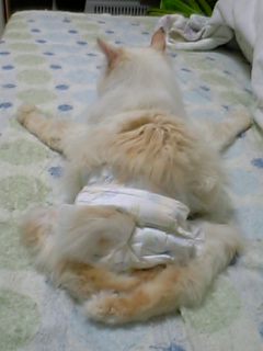 」時間のあるときに、紙おむつにしっぽ穴をあけ、粘着包帯で穴の周りをカバー。