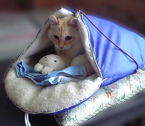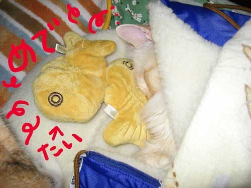 寒い日は寝袋に入って寝てるハリーです。
